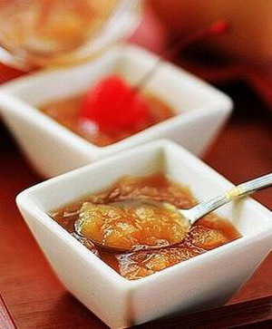 菠蘿果醬 菠蘿果醬保留了新鮮水果的口味和果肉纖維,果香純正,口感細軟、酸甜,營養極為豐富。很適合給小朋友在塗抹蛋糕或麵包時使用;直接挖一勺果醬加進溫熱水,更是一杯味道超讚的菠蘿果汁哦。