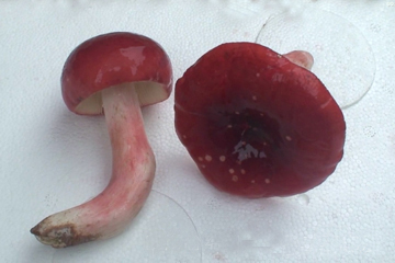 型態特征:   菌蓋寬4—9厘(li)米(mi),扁(bian)半(ban)球(qiu)形(xing),後(hou)平(ping)展(zhan)至(zhi)中(zhong)下(xia)凹(ao),不(bu)粘(zhan),無(wu)光(guang)澤(ze)或(huo)絨(rong)狀(zhuang),中(zhong)部(bu)有(you)時(shi)被(bei)白(bai)粉(fen),珊(shan)瑚(hu)紅(hong)色(se)或(huo)更(geng)鮮(xian)豔(yan),可(ke)帶(dai)莧(xian)菜(cai)紅(hong)色(se),邊(bian)緣(yuan)有(you)時(shi)為(wei)杏(xing)黃(huang)色(se),部(bu)分(fen)或(huo)全(quan)部(bu)褪(tui)至(zhi)粉(fen)肉(rou)桂(gui)色(se)或(huo)淡(dan)白(bai)色(se),邊(bian)緣(yuan)無(wu)條(tiao)紋(wen)。菌(jun)肉(rou)白(bai)色(se),厚(hou),常(chang)被(bei)蟲(chong)吃(chi)。味(wei)道(dao)及(ji)氣(qi)味(wei)好(hao),但(dan)嚼(jiao)後(hou)慢(man)慢(man)有(you)點(dian)辛(xin)辣(la)味(wei)或(huo)薄(bo)荷(he)味(wei)。菌(jun)褶(zhe)白(bai)色(se),老(lao)後(hou)變(bian)為(wei)乳(ru)黃(huang)色(se),近(jin)蓋(gai)緣(yuan)處(chu)可(ke)帶(dai)紅(hong)色(se),稍(shao)密(mi)至(zhi)稍(shao)稀(xi),常(chang)有(you)分(fen)叉(cha),褶(zhe)間(jian)具(ju)橫(heng)脈(mai)。菌(jun)柄(bing)長(chang) 3.5—5厘米,粗0.5—2厘米,白色,一側或基部帶淺珊瑚紅色,圓柱形或向下漸細,中實或鬆軟。孢子印淺乳黃色。孢子無色,近球形,有小疣,7.5—9×7.3—8.1微米。囊狀體近梭形,51—85×8—13微米。