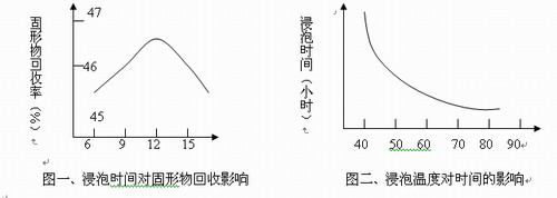 圖一、浸泡時間對固形物回收影響 圖二、浸泡溫度對時間的影響