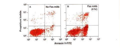 下圖給出的是在使用FAS單抗誘導前後的檢測結果,橫坐標是Annexin-V FITC, 縱坐標是PI,左上、右上、左下、右下四個象限中右上象限代表死亡的細胞,左下象限是存活的細胞,右下象限是凋亡的細胞。