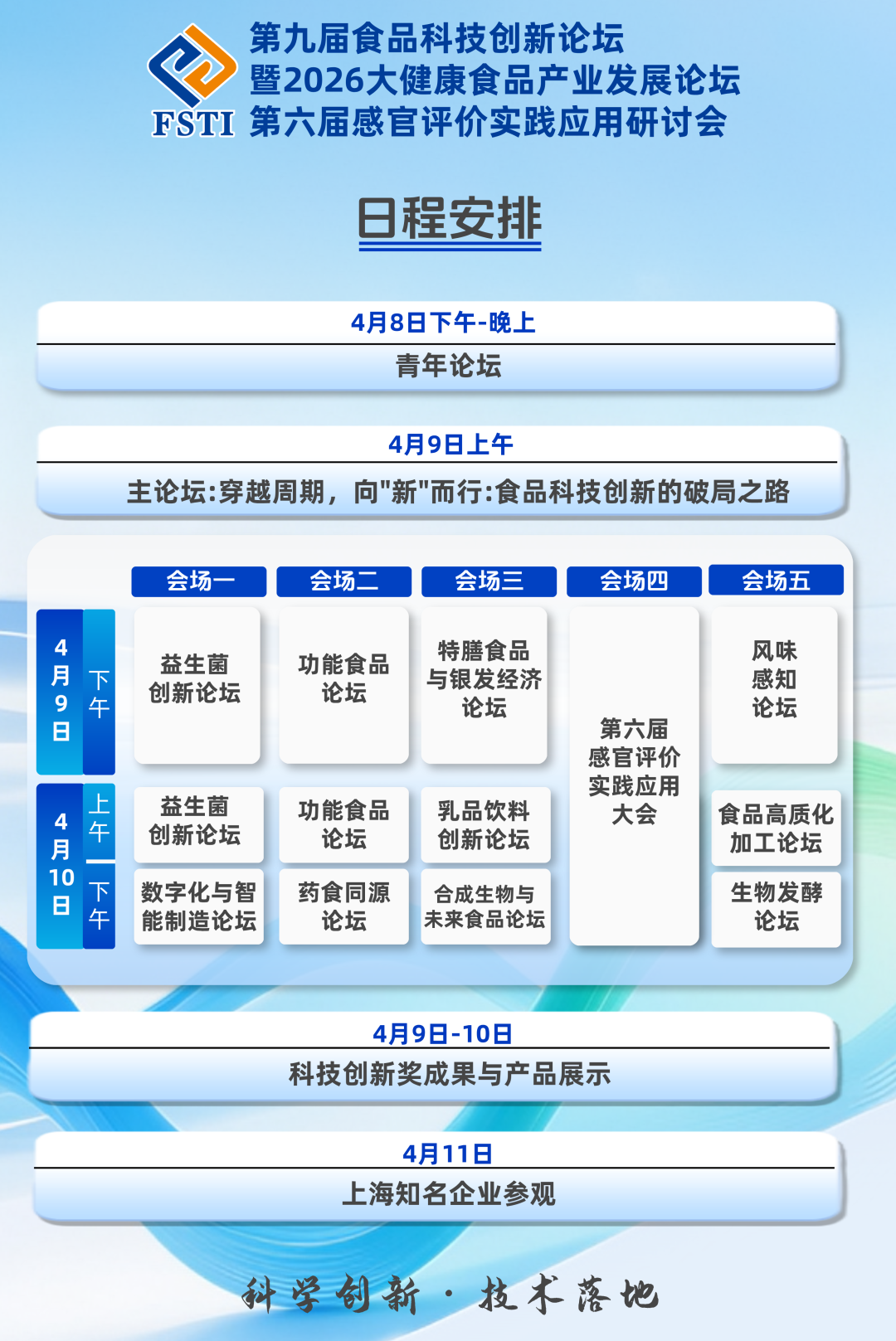 食品科技創新論壇已連續成功舉辦八屆,采用一個主論壇+多個分論壇並行的科學模式,聚焦行業技術創新熱點,緊跟行業發展趨勢。本次論壇為期三天,由1個食品創新發展主論壇與11個專題分論壇和青年論壇組成。11個主題分論壇分別為益生菌創新論壇、功能食品論壇、特膳食品與銀發經濟論壇、乳品飲料創新論壇、藥食同源論壇、合成生物與未來食品論壇、數字化與智能製造論壇、風味感知論壇、食品高質化加工論壇、生物發酵論壇、感官評價實踐應用大會。