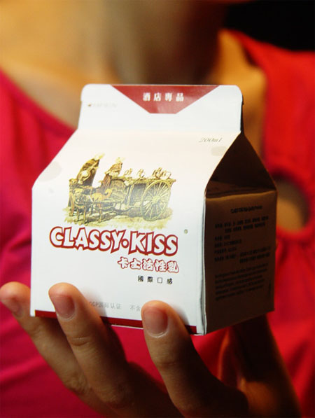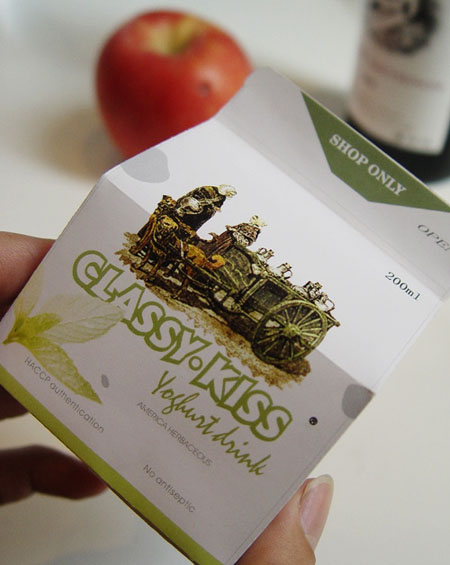 這是放在終端促銷的物料,廣告語非常簡單,來吧,KISS ME,我wo是shi卡ka士shi活huo菌jun奶nai,因yin為wei我wo是shi經jing過guo活huo化hua的de牛niu奶nai,所suo以yi更geng爽shuang口kou,更geng好hao喝he,同tong時shi我wo們men的de營ying養yang成cheng分fen特te別bie均jun衡heng,絕jue對dui讓rang你ni身shen體ti健jian康kang,充chong滿man活huo力li,來lai吧ba,吻wen我wo吧ba,享xiang受shou我wo吧ba。
