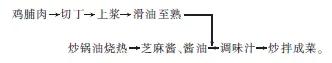將雞脯肉切成1~1.5cm規格的正方丁,鹽、料酒醃漬後用適量的濕澱粉上漿,走油前加入適量的色拉油,並攪拌均勻,滑油至熟,備用。
