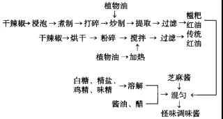 按此工藝配方即可生產出色澤棕紅油亮、香氣諧調、酸甜麻辣鮮各味協調、沾味效果好且怪味特色突出的怪味調味醬。
