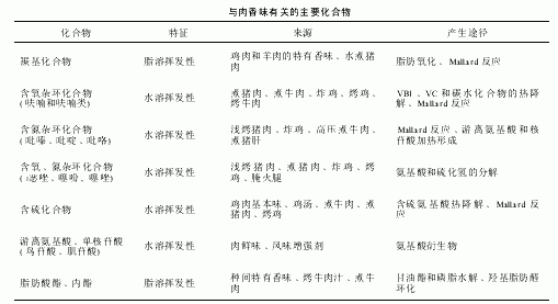 氨基酸和蛋白質的熱分解產物:該類物質因加熱發生裂解,氨基酸經過脫胺、脫羧反應生成揮發性物質,如主要是醇、醛、胺及硫化物等。羰氨反應形成的風味:糖和氨基酸的混合物在加熱時發生Maillard和Strecker降解產生的各類風味化合物如吡嗪、口惡唑、噻吩、噻唑和一些含硫的的雜環化合物。脂質降解:現在普遍認為畜禽肉的特征風味是由脂類物質降解形成的,脂肪在加熱過程中發生氧化反應,生成過氧化物,過氧化物進一步分解生成幾百種香氣閾值很低的揮發性化合物,包括脂族烴、醛類、酮類、醇類、羥酸和脂。脂肪不僅在加熱反應中產生香味,而且與Maillard反應相互作用,產生一些含有長鏈烷基取代基(C5 C15)的O-、N-或S-雜環揮發性化合物,使肉的香味更加和諧和濃鬱。但脂質氧化、脂肪酸敗也會產生不良的氣味。肉製品風味的形成與原料肉的種類、含量、加工工藝等關係很大,一般來說,肉含量高的產品肉本身風味相對突出。不同的加工溫度和方式(蒸煮、烘烤、煙熏),會使產品形成的呈味物質不同,從而會出現不同的風味(見下表)。雖然肉製品在加熱過程中能產生一定的香味,但其香味一般都達不到令消費者滿意的效果,同時還會產生一些腥、膩、臭等不良氣味。特別是西式灌腸和火腿製品,一般都在80~90℃低溫蒸煮,肉的基本香味沒有反應出來,同時,由於產品外都包裹有腸衣,肉的腥、膩、臭味散發不出來,直接影響產品的風味。因此,為確保加工出的肉製品達到風味最佳,就需要對肉製品進行調香。肉製品的調香包含兩個方麵:賦香和提香。提香(突出本香)就是去腥,去除原料的不良氣味,發掘出肉類本身的香味,隻有把腥臭味去掉,肉的香味才能突出出來;賦香就是賦予產品一種特有風味,賦香是外因,提香是內因,調香應內外兼顧。