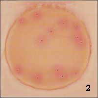 Coliform count = 2食品顆粒通常呈不規則形狀,且不帶有氣泡。見圓圈1。在測試片上,人為的氣泡可能由於接種不當引起,其形狀不規則,且不帶有紅色菌落。見圓圈2 。 |