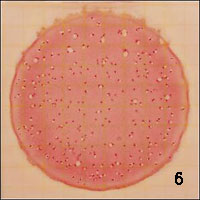 Coliform count = 30圓圈1, 2和3中的氣泡形狀有所不同。圓圈1中的氣泡和菌落相鄰;圓圈2中的氣泡撐破了菌落,使菌落看似氣泡的“輪廓”;圓圈3中的菌落被3個小氣泡圍住。細菌學手冊上規定,紅色不帶有氣泡的菌落不計作大腸菌群。 |