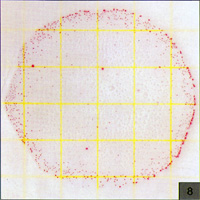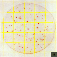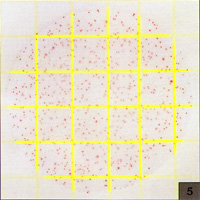 Count=560測試片麵積約為20cm2,當菌落數超過250個,如圖5所示,為了估計菌落數,可選擇其中一個或數個有代表性菌落的小方格(1cm2),計算平均菌落數,再乘以20可得到整個測試片上的菌落數 |